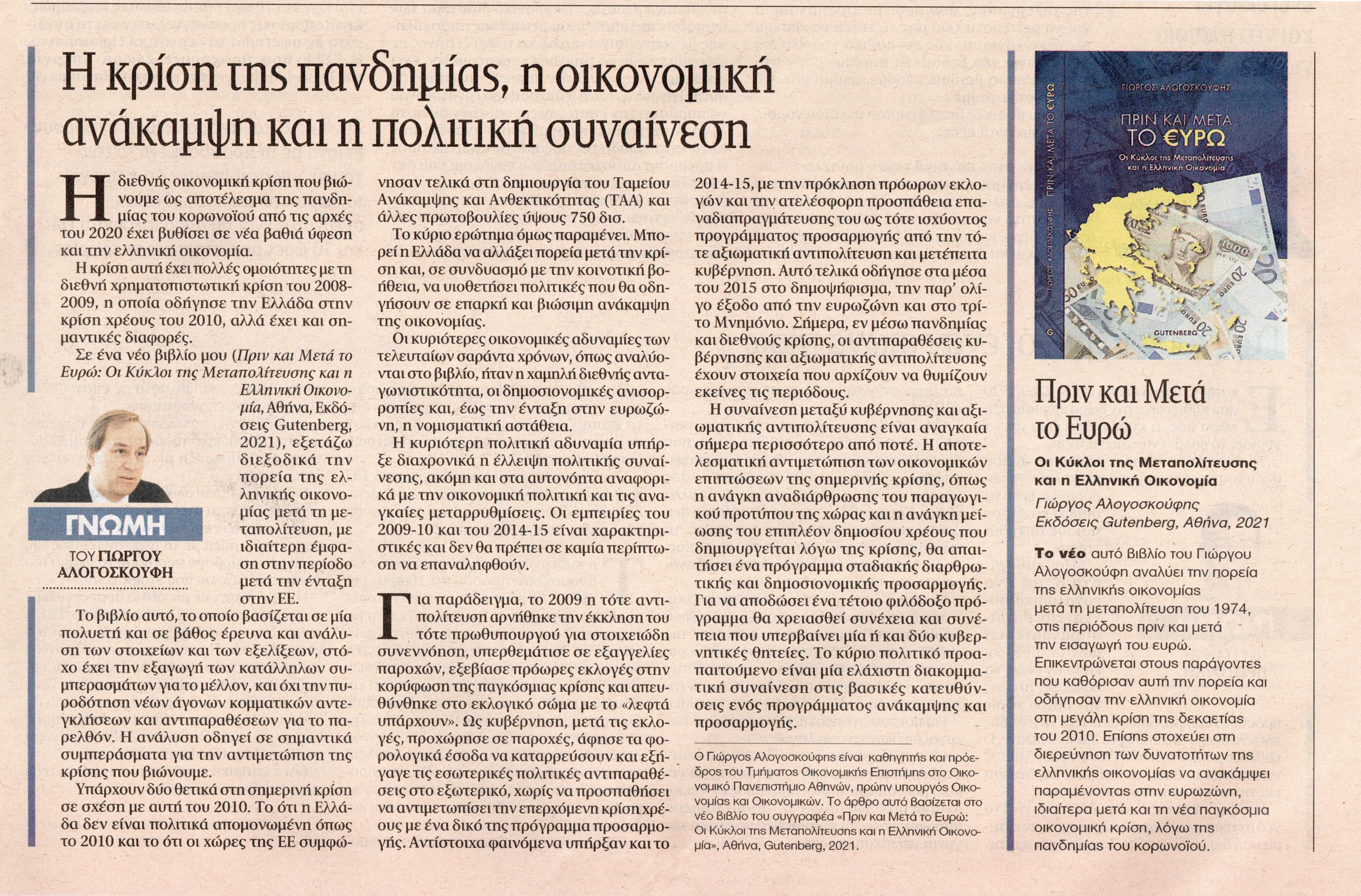 Προσαρμοσμένο άπο άρθρο του Γιώργου Αλογοσκούφη στην εφημερίδα ΤΑ ΝΕΑ, Σάββατο, 17, Απριλίου 2021. Το άρθρο δημοσιεύθηκε με την ευκαιρία της έκδοσης του νέου του βιβλίου, Πριν και Μετά το Ευρώ: Οι Κύκλοι της Μεταπολίτευσης και η Ελληνική Οικονομία, Εκδόσεις Gutenberg, Αθήνα, 2021.