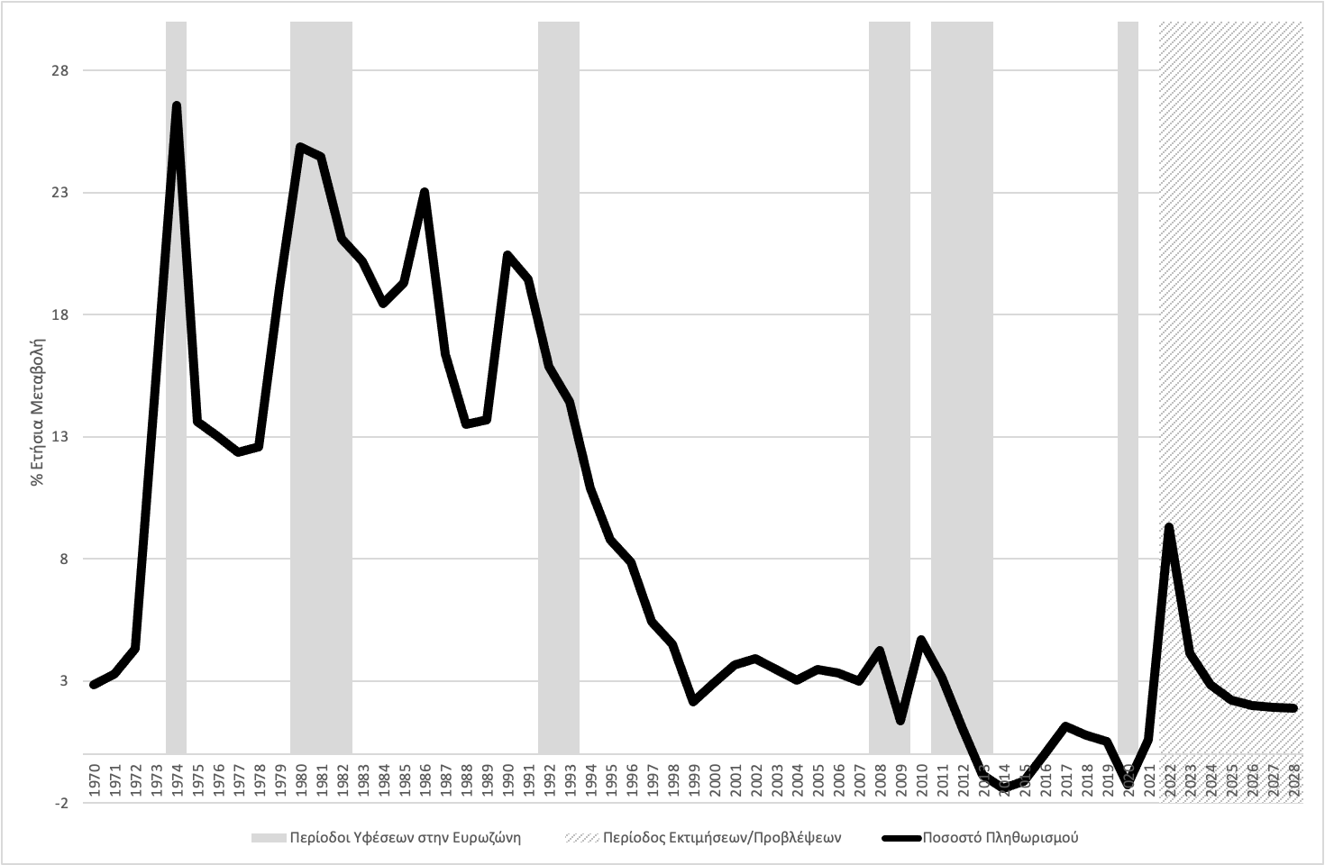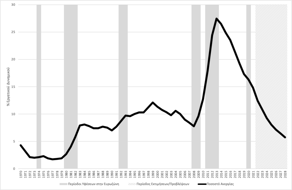 Η ανεργία αναμένεται να μειωθεί από 11,2% του εργατικού δυναμικού το 2023 σε 5,7% το 2028, που, αν συμβεί, θα είναι το χαμηλότερο ποσοστό ανεργίας από τις αρχές της δεκαετίας του 1980. Σε μεγάλο βαθμό αυτό είναι αποτέλεσμα και της μείωσης της προσφοράς εργασίας, λόγω του δημογραφικού. Υπενθυμίζουμε ότι το ποσοστό ανεργίας είχε πέσει στο 7,8% του εργατικού δυναμικού το 2008, στην αρχή της διεθνούς χρηματοπιστωτικής κρίσης (Γράφημα 2). Στη συνέχεια εξερράγη, ειδικά τα δύο πρώτα χρόνια μετά την κρίση του 2010.