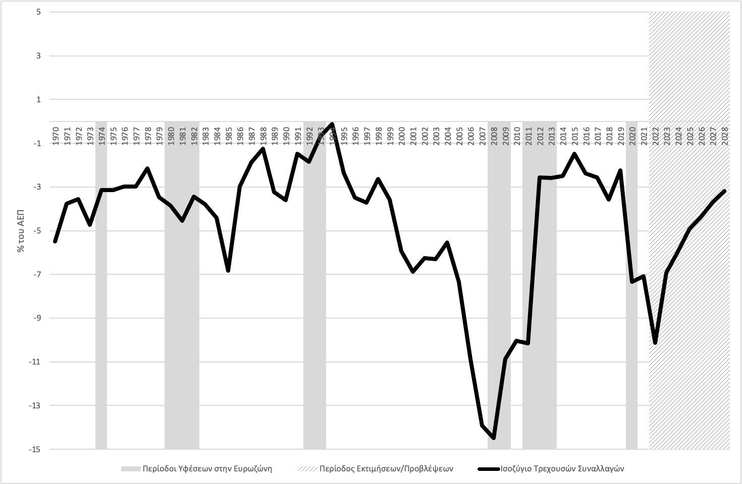 Το έλλειμμα του ισοζυγίου τρεχουσών συναλλαγών αναμένεται να είναι στο 6,9% του ΑΕΠ το 2023, από 9,6% του ΑΕΠ το 2022. Στη συνέχεια προβλέπεται ότι θα συνεχίσει να μειώνεται, αλλά προβλέπεται να παραμείνει πάνω από το 3% του ΑΕΠ μέχρι το 2028 ( Γράφημα 4). Πρόκειται για μια πολύ ανησυχητική εξέλιξη, καθώς η κυριότερη αιτία της κρίσης δανεισμού του 2010 και της μεγάλης καθίζησης που ακολούθησε ήταν η ταχεία συσσώρευση εξωτερικού χρέους μέσω των επίμονων ελλειμμάτων του ισοζυγίου τρεχουσών συναλλαγών.