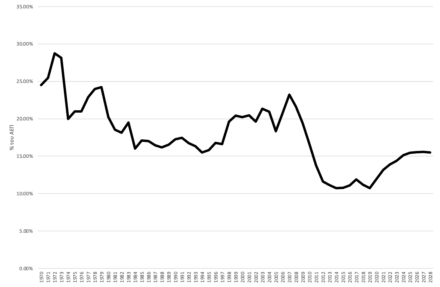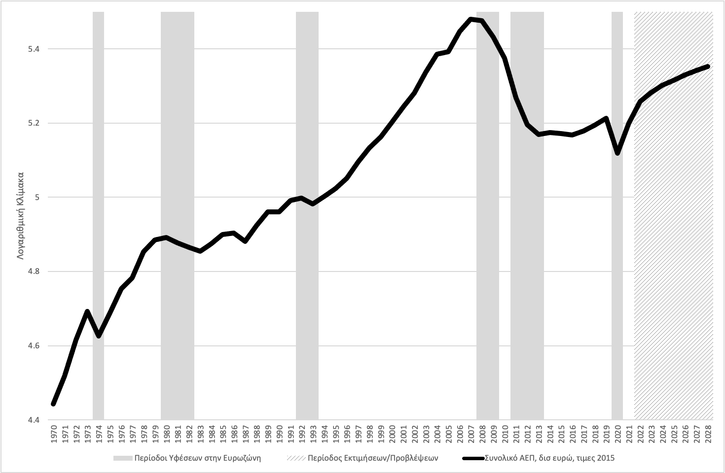 Για την πενταετία 2024-2028, ο προβλεπόμενος μέσος ετήσιος ρυθμός αύξησης του ΑΕΠ είναι μόνο 1,4%. Ακόμη και το 2028, το πραγματικό ΑΕΠ της Ελλάδας θα είναι μόλις 211,2 δισ. ευρώ του 2015, έναντι 239,7 δισ. κατά το 2007, πριν από τη διεθνή χρηματοπιστωτική κρίση και την ελληνική κρίση του 2010. Είκοσι χρόνια μετά τις δίδυμες κρίσεις , το πραγματικό ΑΕΠ της Ελλάδας προβλέπεται να παραμένει 12% κάτω από το προ κρίσης επίπεδο (Γράφημα 1). Το κατά κεφαλήν ΑΕΠ το 2028 προβλέπεται επίσης να είναι χαμηλότερο από το ανώτατο όριο επίπεδο του το 2007, κατά 6,5%.