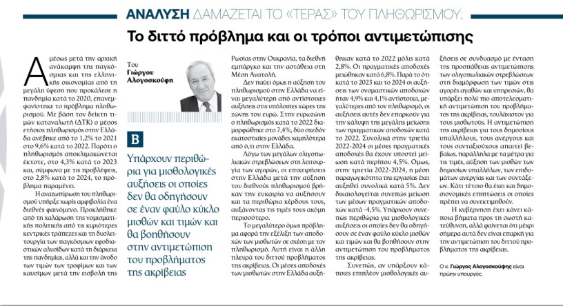 Συμπερασματικά, το πρόβλημα της ακρίβειας είναι διττό: Από τη μία οι τιμές αυξάνονται περισσότερο στην Ελλάδα από ότι δικαιολογείται από τις διεθνείς αυξήσεις και από την άλλη οι αυξήσεις των αποδοχών των μισθωτών, και πολύ περισσότερο των συνταξιούχων, αλλά και των επιτοκίων των καταθετών, δεν επαρκούν για την κάλυψη του αυξημένου πληθωρισμού.