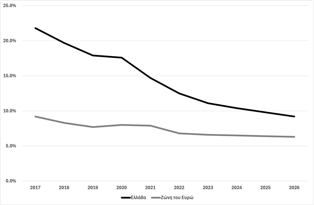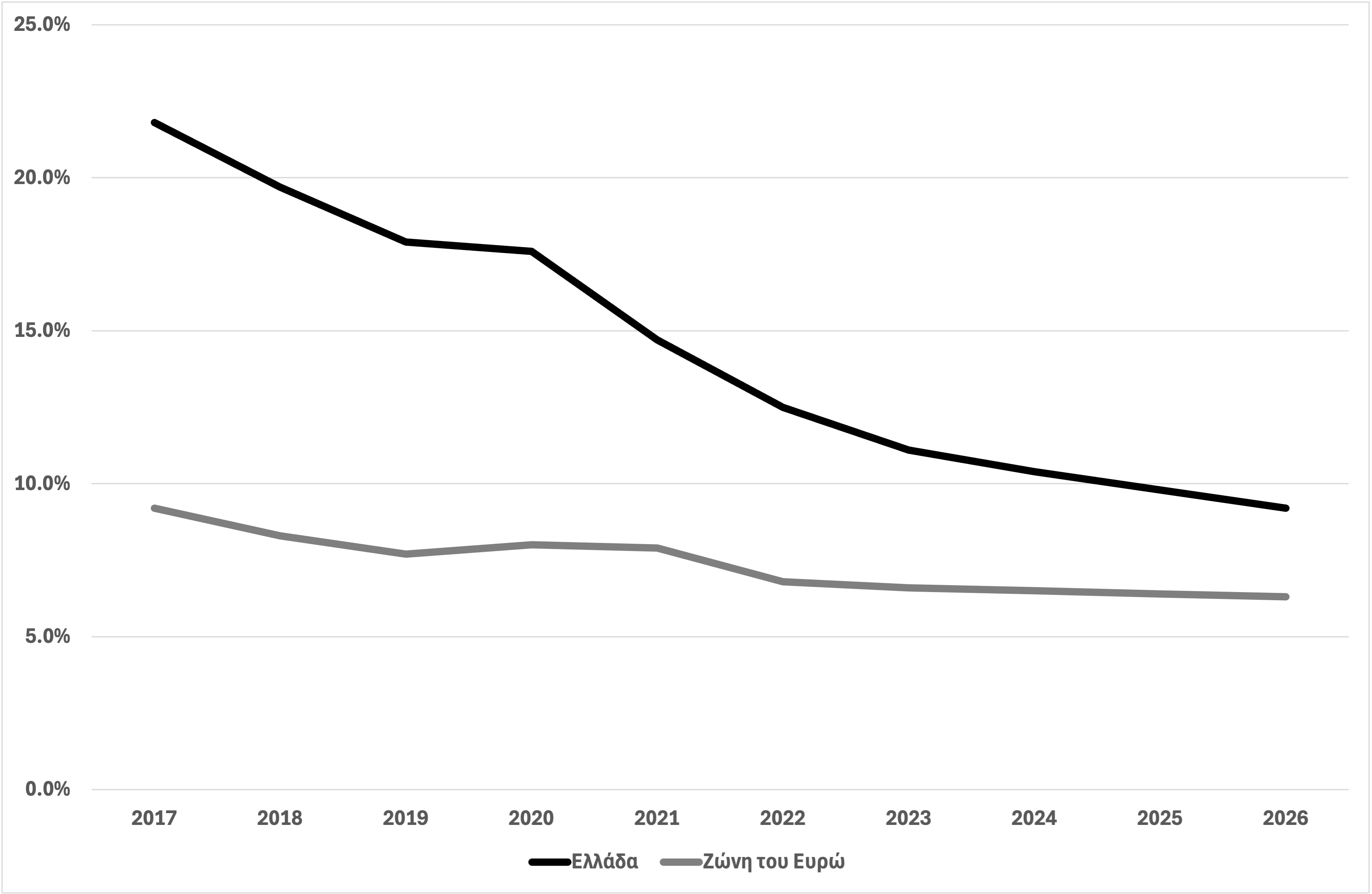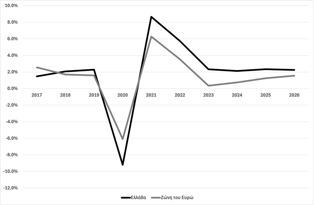 Αναφορικά με την Ελλάδα η οικονομική δραστηριότητα αναμένεται να επεκταθεί κατά 2,1% το 2024 και να διατηρήσει μια γενικά παρόμοια ανάπτυξη το 2025 και το 2026, υποστηριζόμενη από την εφαρμογή του Σχεδίου Ανάκαμψης και Ανθεκτικότητας (ΧΑΑ). Η ανεργία, ήδη κάτω από το 10%, αναμένεται να συνεχίσει να μειώνεται αλλά πιο αργά από ό,τι στο παρελθόν. Ο πληθωρισμός προβλέπεται σε 3,0% το 2024 και αναμένεται να μετριαστεί μόνο σταδιακά σε περίπου 1,9% έως το 2026. Το έλλειμμα της γενικής κυβέρνησης προβλέπεται να συνεχίσει να μειώνεται λόγω της συγκρατημένης αύξησης των δαπανών. Μαζί με τη σταθερή αύξηση του ονομαστικού ΑΕΠ, αυτό συμβάλλει στη σταθερή μείωση του δημόσιου χρέους προς το ΑΕΠ κοντά στο 140% του ΑΕΠ έως το 2026.