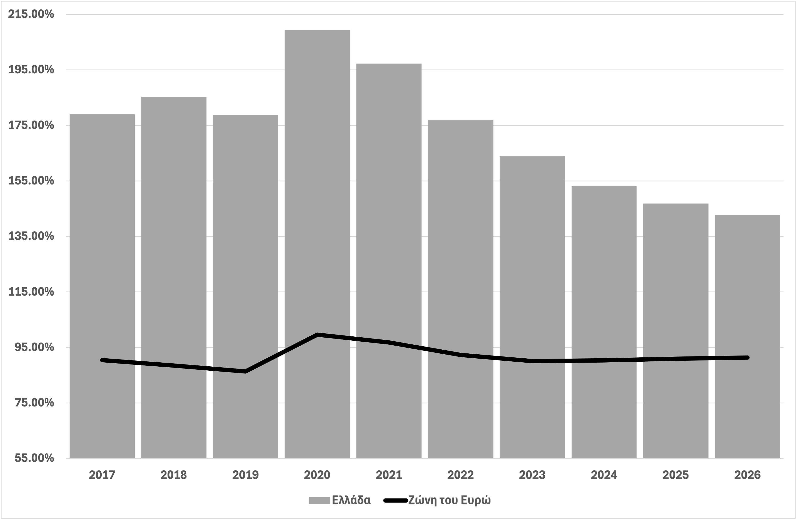 Ωστόσο, ο δείκτης του συνολικού χρέους προς το ΑΕΠ της ΕΕ προβλέπεται να αυξηθεί, από 82,1% το 2023 σε 83,4% το 2026. Αυτό ακολουθεί μια μείωση κατά σχεδόν 10 εκατοστιαίες μονάδες μεταξύ 2020 και 2023 και αντανακλά την επίδραση των ακόμη υψηλών πρωτογενών ελλειμμάτων και των αυξανόμενων δαπανών για τόκους, που δεν αντισταθμίζονται πλέον από την υψηλή αύξηση του ονομαστικού ΑΕΠ καθώς ο πληθωρισμός υποχωρεί. Στη ζώνη του ευρώ, το δημόσιο χρέος προβλέπεται να αυξηθεί από 88,9% του ΑΕΠ το 2023 σε 90% το 2026.