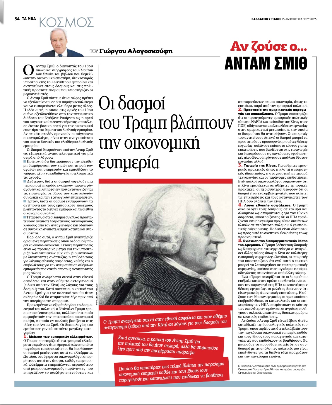 Μία συντομότερη μορφή αυτού του άρθρου, χωρίς τις αναφορές στα ίδια τα λόγια του Άνταμ Σμιθ, δημοσιεύθηκε στην εφημερίδα Τα Νέα, στις 15 Φεβρουαρίου 2025.