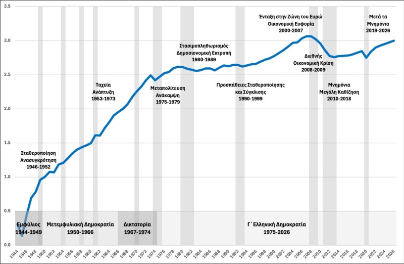 Στα 25 χρόνια πριν την μεταπολίτευση του 1974, το πραγματικό κατά κεφαλήν ΑΕΠ της Ελλάδας, μετρούμενο σε σταθερές τιμές του 2020, είχε υπέρ-πενταπλασιαστεί, από €2.197 το 1948 σε €12.079 το 1973. Ο μέσος ετήσιος ρυθμός μεγέθυνσης του ήταν 7,2%. Η εξέλιξη του παρουσιάζεται στο Γράφημα αυτής της Εβδομάδας .