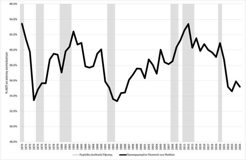 Το προσαρμοσμένο ποσοστό των μισθών στο ΑΕΠ (adjusted wage share) είναι ένας από τους πιο χρήσιμους δείκτες για να κατανοήσουμε τη διαχρονική κατανομή του εισοδήματος μεταξύ εργασίας και κεφαλαίου.