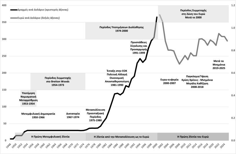 Το επισυναπτόμενο γράφημα αυτής της εβδομάδας δείχνει την εξέλιξη της συναλλαγματικής ισοτιμίας του νομίσματος της Ελλάδας από το 1948 έως σήμερα. Για την περίοδο 1948-2000 παρουσιάζεται η συναλλαγματική ισοτιμία της δραχμής και από το 2001 και μετά η συναλλαγματική ισοτιμία του ευρώ. Τα στοιχεία είναι ετήσιοι μέσοι όροι και προέρχονται από το Διεθνές Νομισματικό Ταμείο (ΔΝΤ).