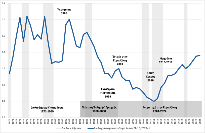 Το επισυναπτόμενο γράφημα αυτής της εβδομάδας δείχνει την εξέλιξη της διεθνούς ανταγωνιστικότητας της ελληνικής οικονομίας από τις αρχές της δεκαετίας του 1970. Η διεθνής ανταγωνιστικότητα μετράται από το αντίστροφο της πραγματικής σταθμισμένης συναλλαγματικής ισοτιμίας, με βάση το μοναδιαίο κόστος εργασίας, έναντι των 15 χωρών της ΕΕ, πριν την διεύρυνση του 2004 (ΕΕ-15). Τα στοιχεία προέρχονται από τη βάση δεδομένων AMECO της Ευρωπαϊκής Επιτροπής και ο δείκτης της διεθνούς ανταγωνιστικότητας λαμβάνει την τιμή 1 το 2020.