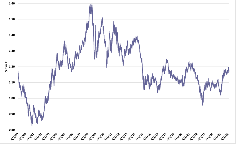 Το επισυναπτόμενο γράφημα αυτής της εβδομάδας δείχνει την εξέλιξη της ισοτιμίας του δολαρίου απέναντι στο ευρώ. Τα στοιχεία είναι ημερήσια, από τις αρχές του 1999, και προέρχονται από την τράπεζα στοιχείων της Ευρωπαϊκής Κεντρικής Τράπεζας.