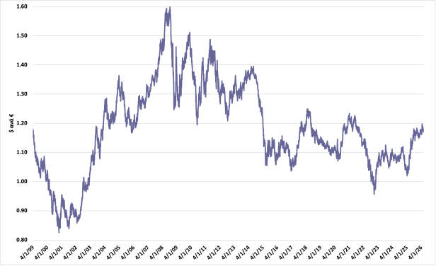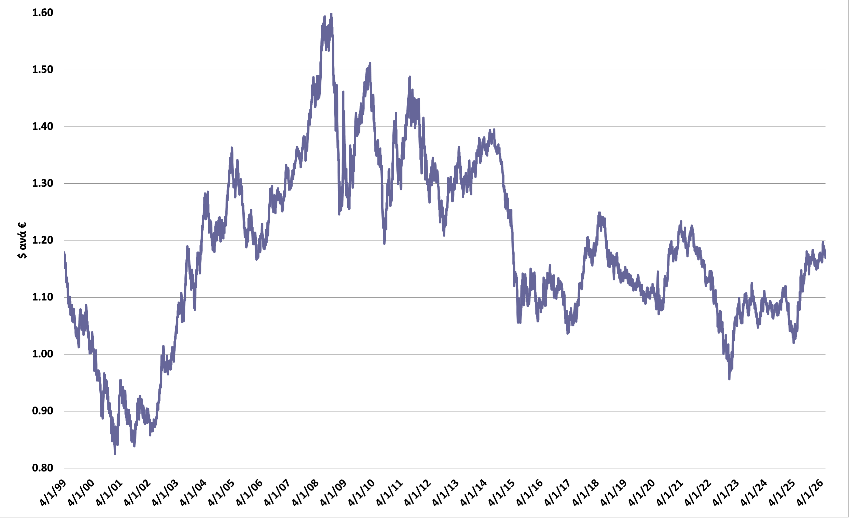 «Η πορεία της ισοτιμίας δολαρίου–ευρώ από το 1999 μέχρι σήμερα αποτελεί, ίσως περισσότερο από οποιονδήποτε άλλο χρηματοοικονομικό δείκτη, έναν καθρέφτη των μεταβολών στην παγκόσμια οικονομική ισορροπία. Στο γράφημα που καλύπτει σχεδόν τρεις δεκαετίες ημερήσιων στοιχείων από την Ευρωπαϊκή Κεντρική Τράπεζα αποτυπώνεται μια διαδρομή γεμάτη διακυμάνσεις, κρίσεις, ανατροπές και νέες ισορροπίες.