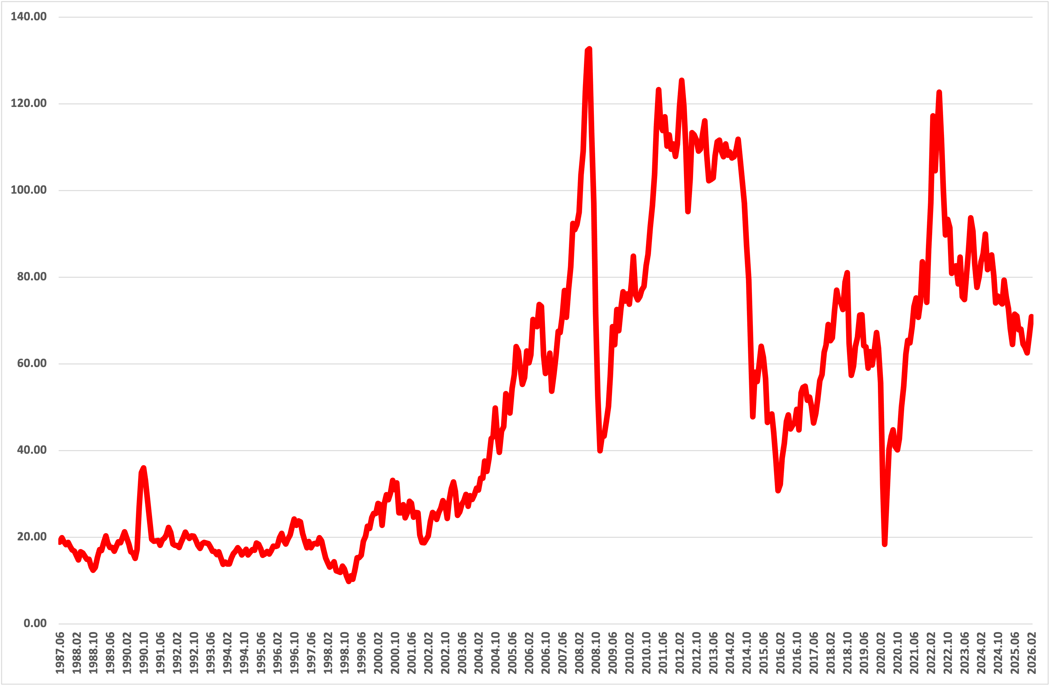 «Η πορεία της τιμής του πετρελαίου αποτελεί έναν από τους πιο ευαίσθητους δείκτες της κατάστασης της παγκόσμιας οικονομίας. Λίγες αγορές αποτυπώνουν τόσο καθαρά τη διασταύρωση οικονομικών κύκλων, γεωπολιτικών εντάσεων και τεχνολογικών εξελίξεων όσο η αγορά του αργού πετρελαίου. Το γράφημα της τιμής του Brent από το 1987 μέχρι σήμερα δείχνει ακριβώς αυτή τη δυναμική: μακρές περιόδους σχετικής ηρεμίας διακόπτουν απότομες κορυφώσεις και βαθιές πτώσεις, που συνδέονται με μεγάλα γεγονότα της διεθνούς οικονομίας και πολιτικής.