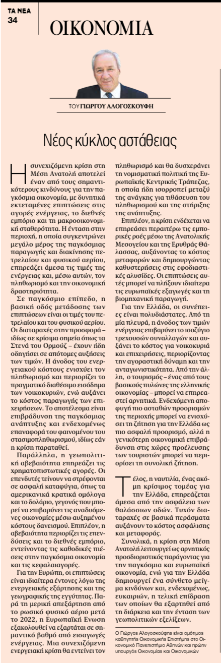 Το άρθρο αυτό δημοσιεύθηκε στην εφημερίδα ΤΑ ΝΕΑ, το Σάββατο 21 Μαρτίου 2026, με τίτλο «Νέος Κύκλος Αστάθειας»