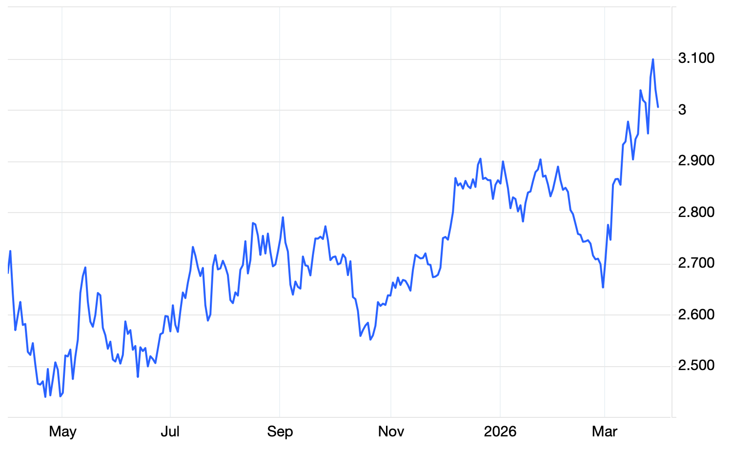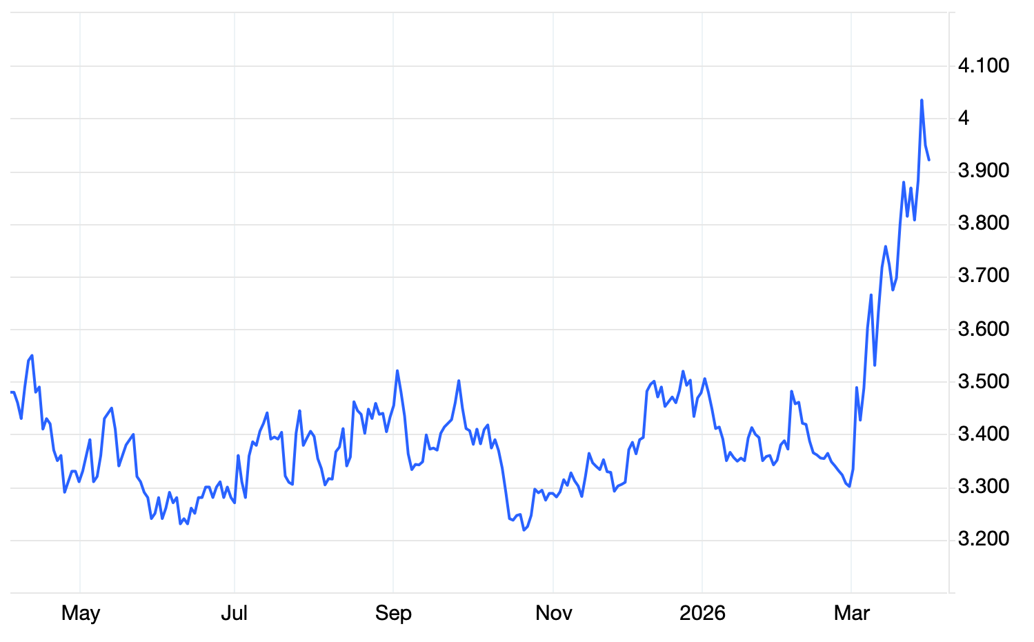 Η πιο χαρακτηριστική εξέλιξη είναι η έντονη και σχετικά απότομη άνοδος των αποδόσεων από περίπου 2,7% στις αρχές του 2026 σε επίπεδα άνω του 3,0%–3,1% τον Μάρτιο 2026. Η άνοδος αυτή είναι ταχεία, συνοδεύεται από αυξημένη μεταβλητότητα και οδηγεί τις αποδόσεις στα υψηλότερα επίπεδα της περιόδου.