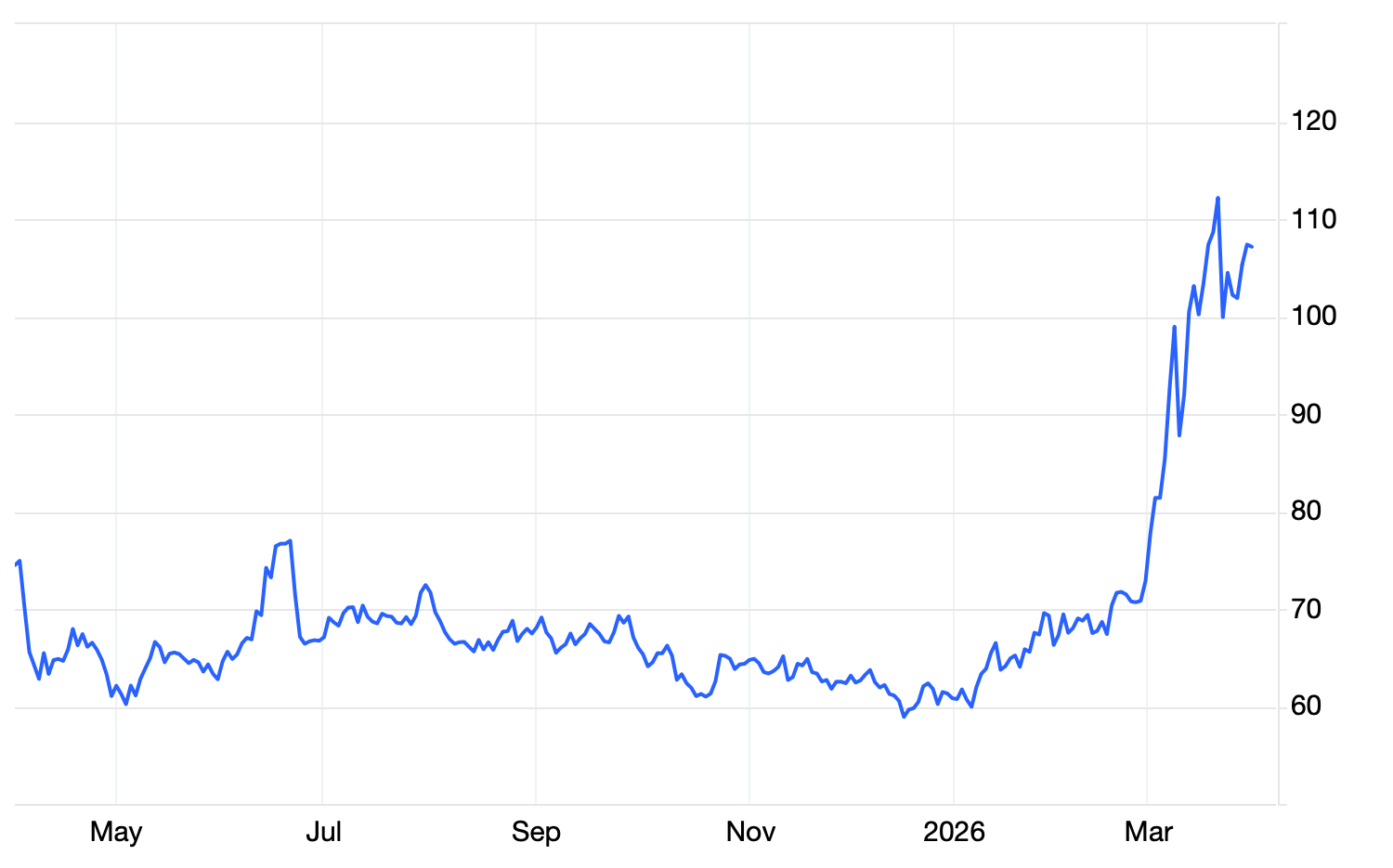 Μετά από μια περίοδο σχετικής σταθερότητας και μιας ήπιας πτωτικής τάσης προς επίπεδα της τάξης των $60-65 το βαρέλι, η τιμή του αργού πετρελαίου Brent άρχισε να αυξάνεται στις αρχές του 2026, ενώ κατά τις τελευταίες εβδομάδες υπήρξε μία πραγματική έκρηξη. Μόνο κατά τον τελευταίο μήνα η τιμή του Brent αυξήθηκε κατά 38% περίπου στα $108 το βαρέλι. Η απότομη αυτή άνοδος συνδέεται άμεσα με την κλιμάκωση της κρίσης στη Μέση Ανατολή. Οι αγορές πετρελαίου αντιδρούν όχι μόνο σε πραγματικές διαταραχές της προσφοράς, αλλά και σε προσδοκίες για μελλοντικούς περιορισμούς.